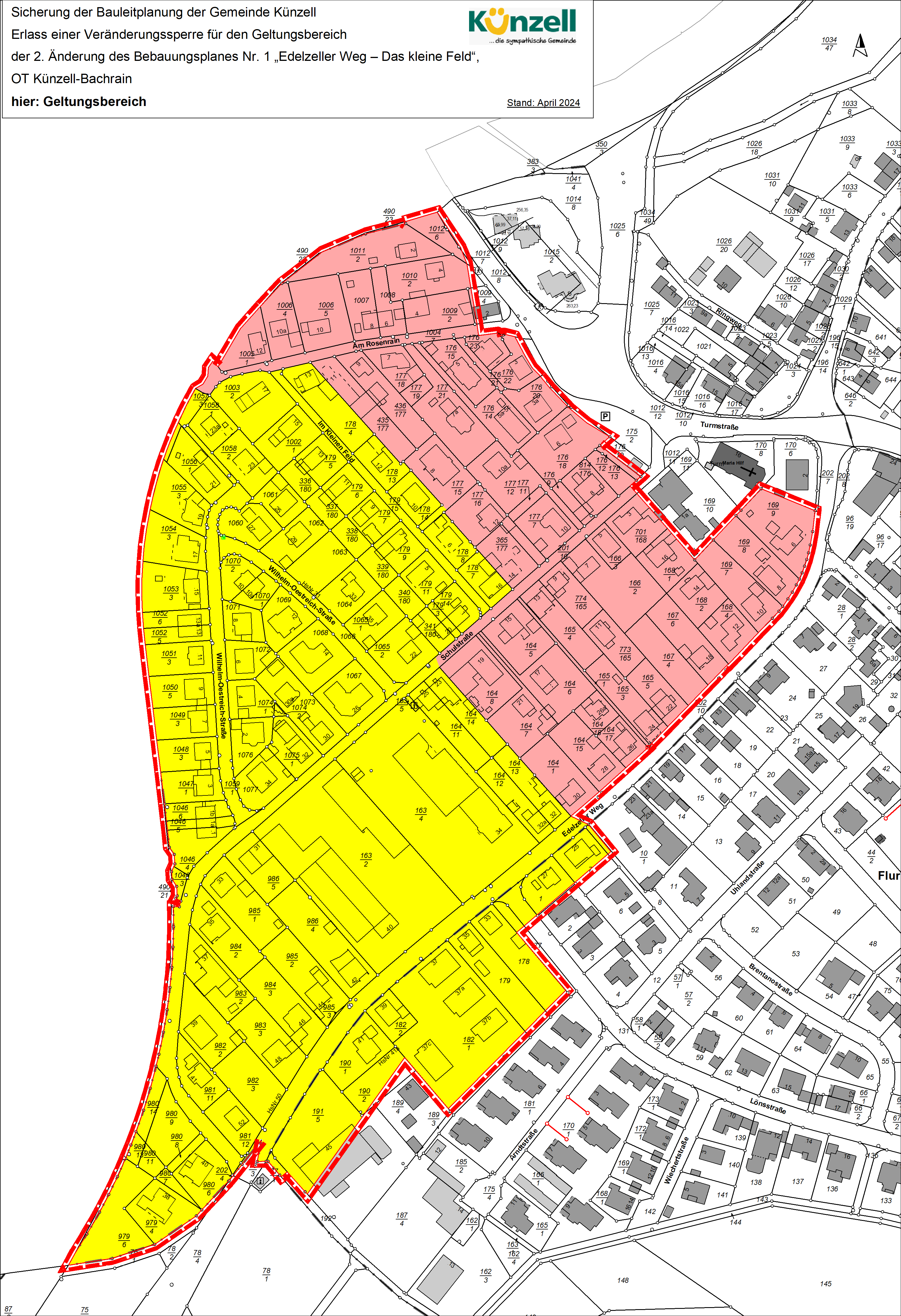 Die Gemeindevertretung der Gemeinde Künzell hat in ihrer Sitzung am 23.05.2024 die Veränderungssperre für das Gebiet der 2. Änderung des Bebauungsplanes Nr. 1 „Edelzeller Weg – Das kleine Feld“, OT Künzell-Bachrain beschlossen, die auf folgende Rechtsgrundlage gestützt wird: