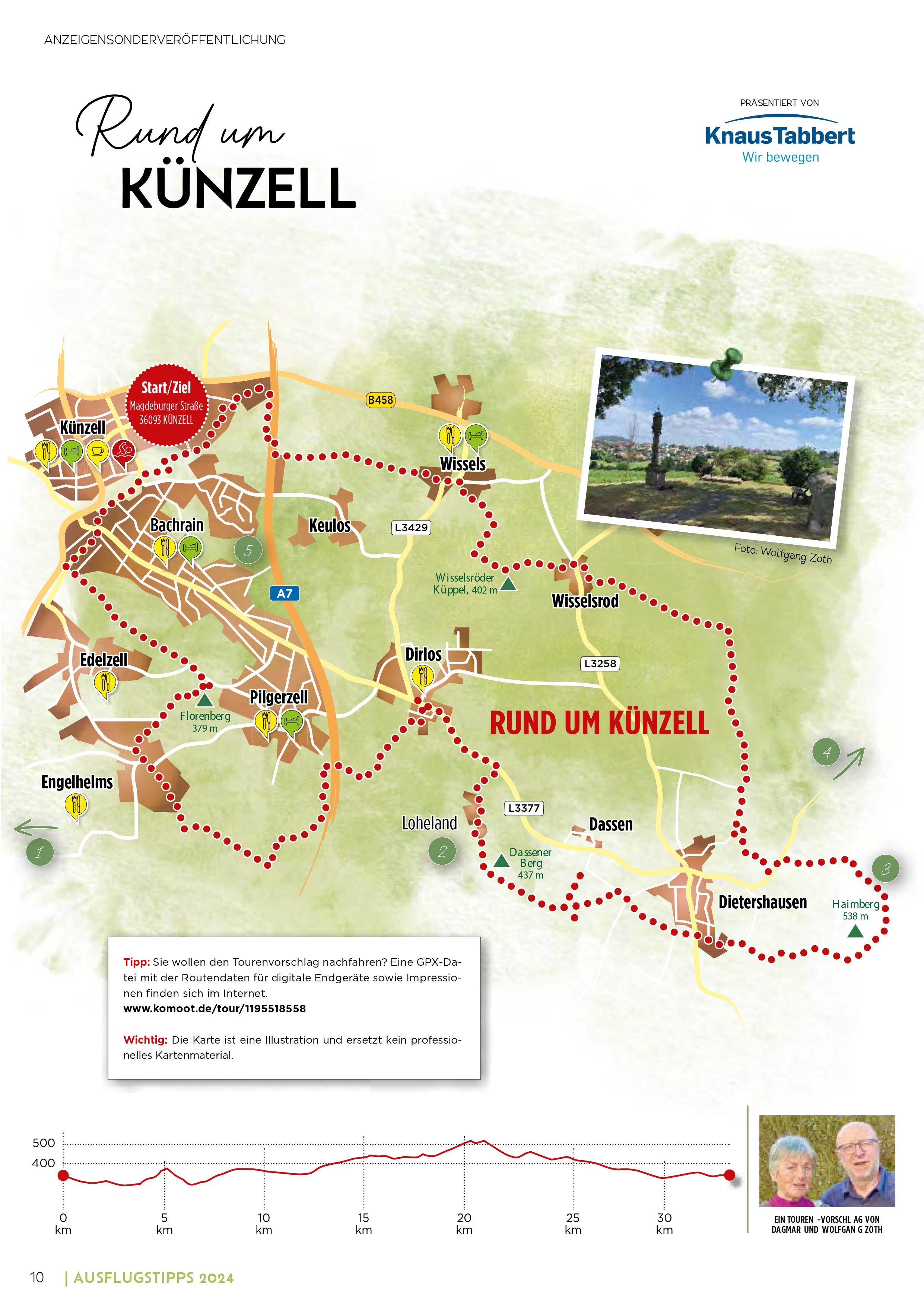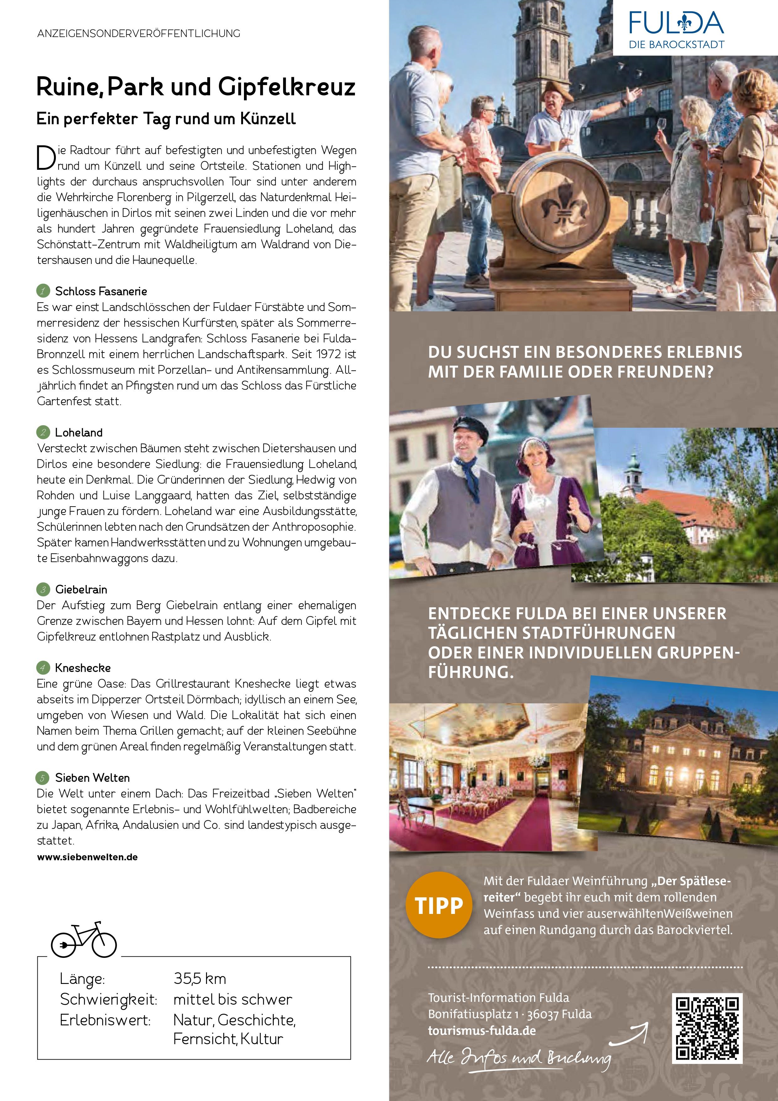 Die Radtour führt auf befestigten und unbefestigten Wegen rund um Künzell und seine Ortsteile. Stationen und Highlights der durchaus anspruchsvollen Tour sind unter anderem die Wehrkirche Florenberg in Pilgerzell, das Naturdenkmal Heiligenhäuschen in Dirlos mit seinen zwei Linden und die vor mehr als hundert Jahren gegründete Frauensiedlung Loheland, das Schönstatt-Zentrum mit Waldheiligtum am Waldrand von Dietershausen und die Haunequelle.